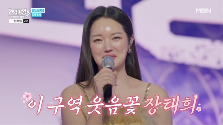 이날 '9등신 트롯 미녀'로 불리는 장태희는 금빛 드레스를 입고 등장해 단번에 시선을 사로잡았다. 그가 무대에 모습을 드러내자 참가자들 사이에서는 "얼굴에 꿀을 발랐나보다", "얼굴에서 어쩜 저렇게 광이 나냐" 등 감탄이 나왔다.