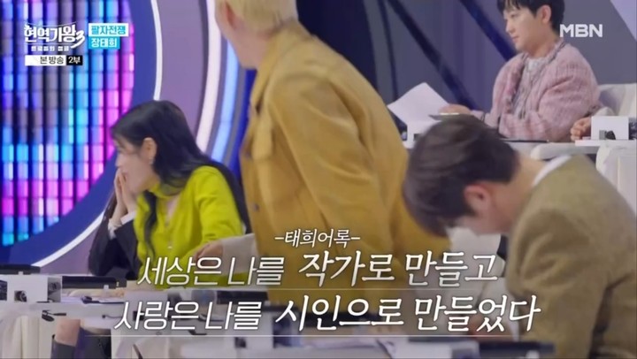 이에 윤명선 작곡가는 "그런 멘트는 따로 준비해서 오시는거냐, 아니면 즉석에서 하는거냐"고 물었고, 장태희는 "저는 항상 세상은 나를 작가로 만들고, 사랑은 나를 시인으로 만들었다고 얘기한다"는 어록을 남겨 또 한 번의 감탄을 자아냈다.