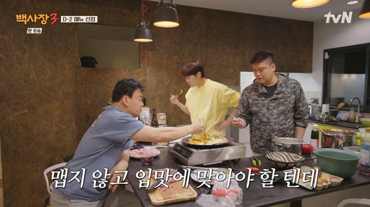 ‘한판집’의 첫 메뉴는 삼겹살. 큰 팬에 구운 삼겹살과 파무침, 김치, 버섯과 떡 등을 가득 놓아 내놓기로 결정하고 현지인 시식을 거쳐 재료를 결정하는 과정을 거쳤다.