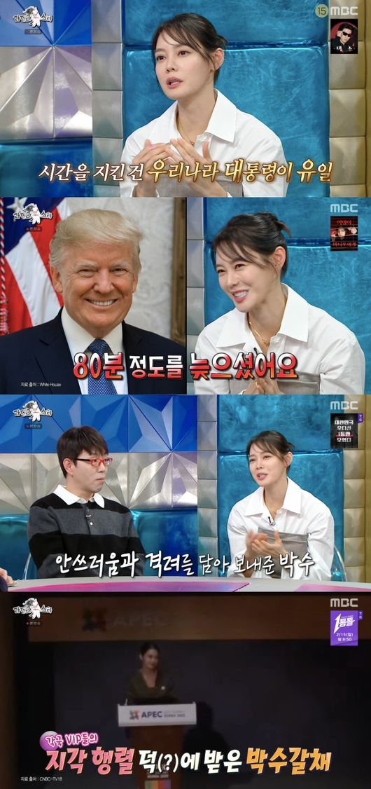 가장 많이 늦은 사람은 바로 미국 트럼프 대통령이었다는 것. 안현모는 “80분 정도 늦으셨다. 진행자로서 행사 지연에 대해 사과하며 ‘차라리 내가 노래라도 할 줄 알고 춤이라도 잘 출 줄 알면 얼마나 좋을까’ 싶었다. 결국 4번 사과했다. 마지막으로 사과하는데 일제히 박수치셨다”라고 당시를 회상했다.