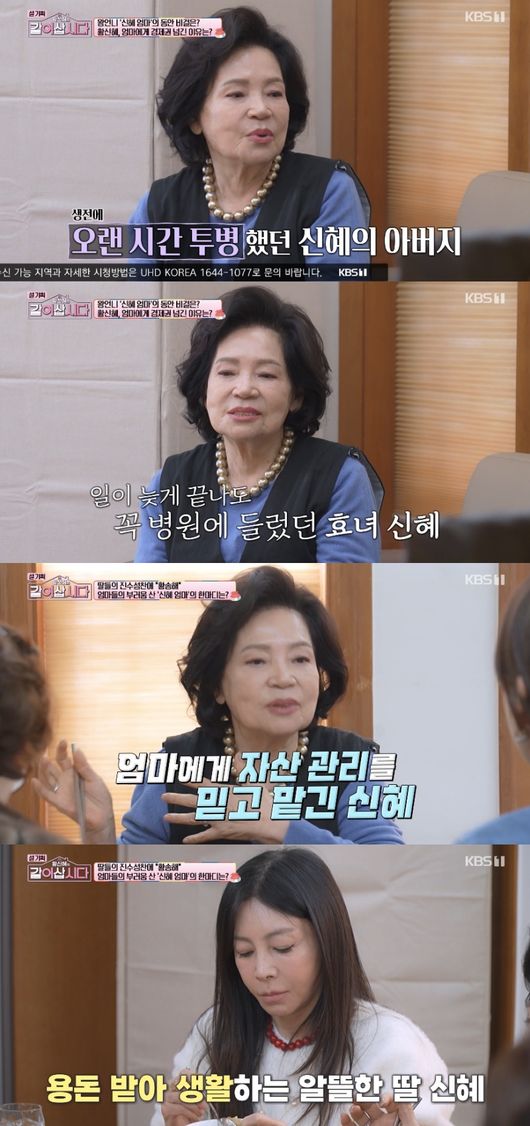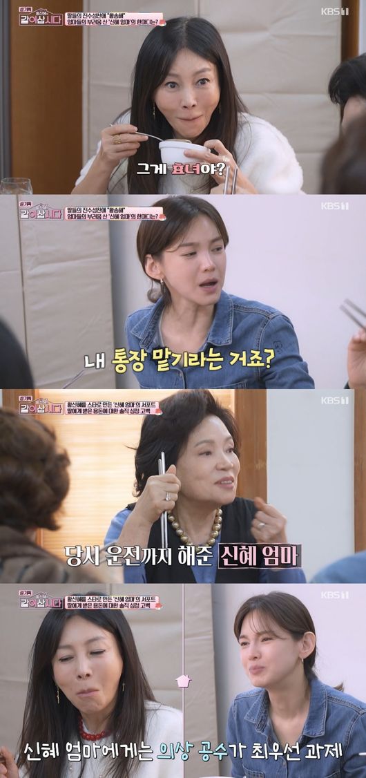 황신혜 어머니는 “(딸이) 자산 관리에 대해 하나도 모른다. 딸이 돈을 벌기 시작하면서 부터 관리부터 소비까지 다 했다. 다 나한테 맡겼다. 얘는 용돈 받아 쓴다”라고 말했다. 이를 들은 정가은 어머니는 “어머니 치매 예방도 될 것 같고 힘이 날 것 같다”고 공감했다.