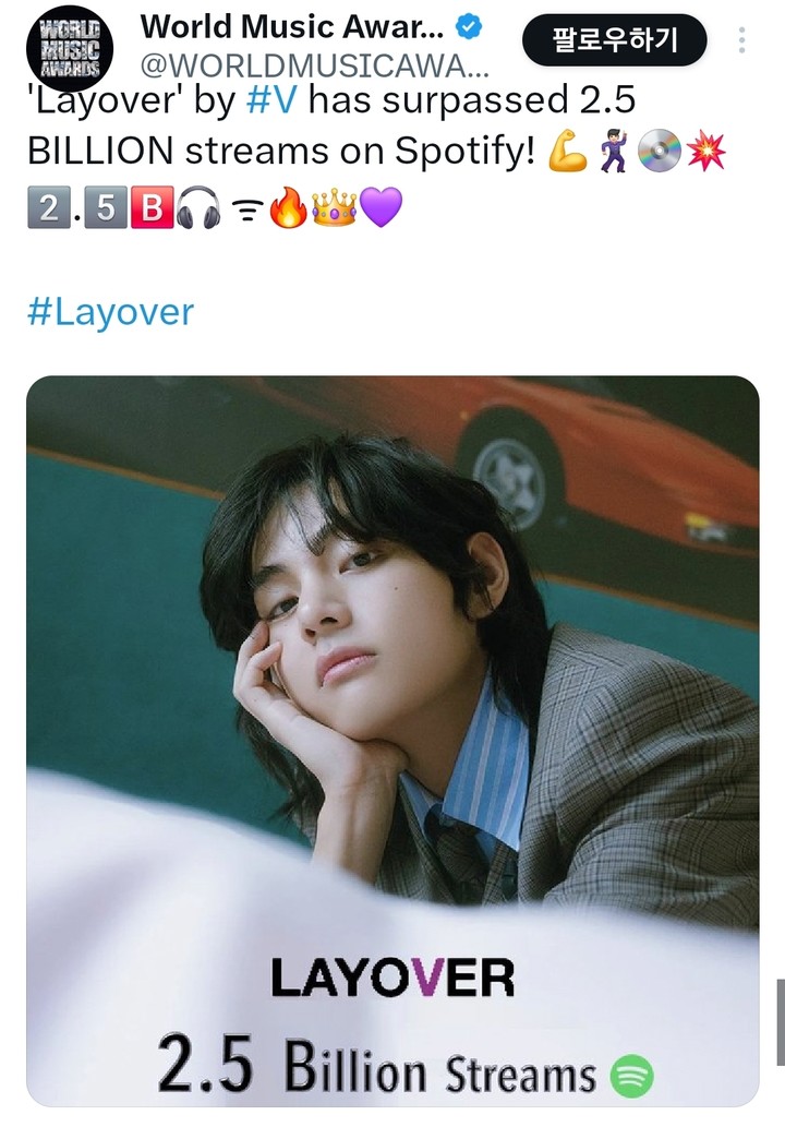 지난 2023년 9월 8일 발매된 뷔의 첫 솔로 앨범 ‘레이오버’(Layover)이 11일 세계 최대 음원스밍 플랫폼 스포티파이에서 총 25억 스트리밍을 돌파했다.