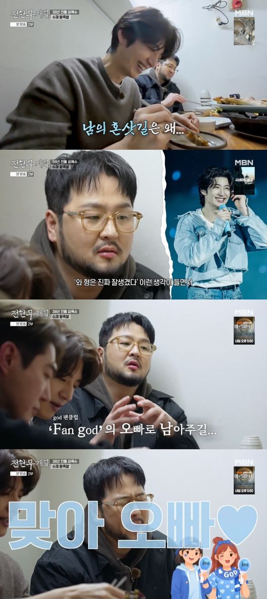 13일 오후에 방송된 종합편성채널 MBN 예능프로그램 ‘전현무계획3’에는 god 멤버 데니안과 손호영, 김태우가 게스트로 출연했다.