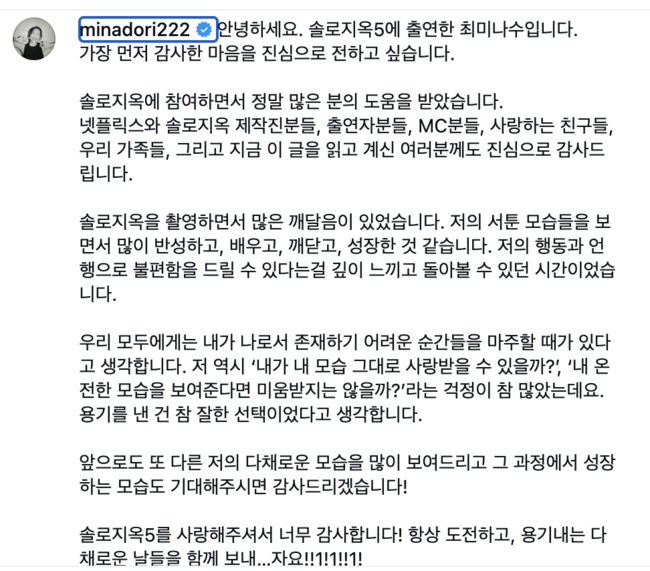 13일 최미나수는 자신의 SNS를 통해 장문의 글을 게재하며 ‘솔로지옥5’ 촬영을 돌아봤다. 그는 방송을 통해 비춰진 자신의 모습에 대해 솔직한 반성과 함께, 그 시간을 통해 얻은 깨달음을 전했다.