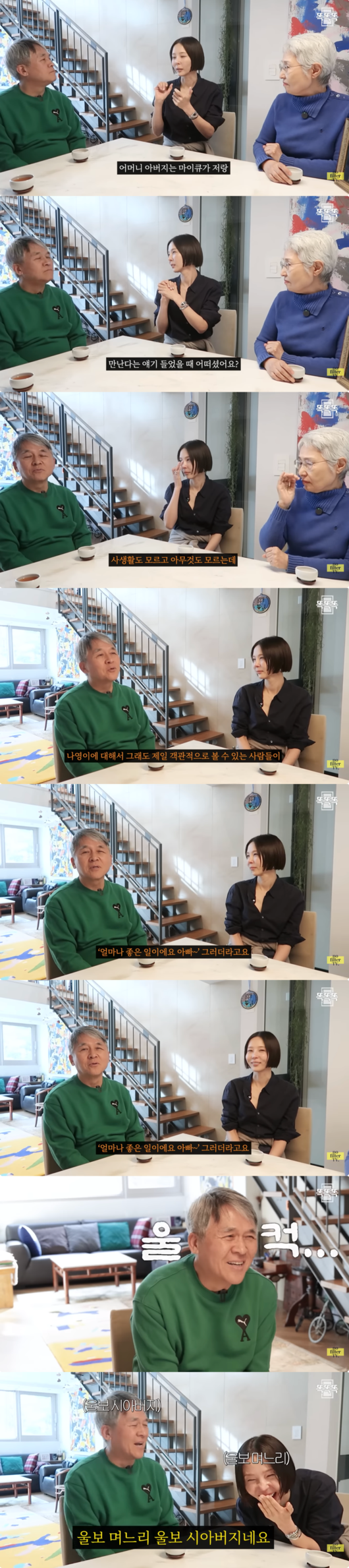 이에 시어머니는 “그래서 우리 두말 하지 않았어요”라고 덧붙였고, 시아버지는 결국 울컥하는 모습을 보였다. 시아버지는 “그래, 나영이 자신만 괜찮으면 됐지. 그리고 주위에서 나영이의 평판이라 그럴까. 따뜻하고 좋고 그렇게 열심히 삶을 살아가는 모습이 모범이 되는 것 같고”라며 며느리를 향한 깊은 신뢰와 애정을 드러내 결혼을 공식적으로 축복하는 듯한 훈훈함을 자아냈다.