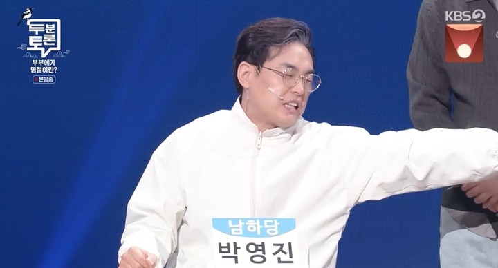 15일 KBS2 '개그콘서트'는 설명절 특집 콩트로 꽉 채워졌다. 이날 '두분 토론'에서는 박영진과 김영희가 설 명절을 주제로 맞붙었다. 남편 대표 '남하당' 박영진은 "아내들이 설 명절에 불만 갖는 것 자체가 문제"라며 토론의 포문을 열었다.