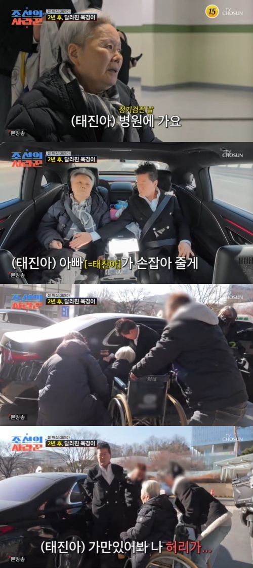 이내 두 사람이 병원에 도착했다. 태진아 아내는 차에서 내리는 것조차 거부했다. 결국 태진아가 부축한 뒤 직접 휠체어에 앉혀야 했다. 그러나 아내가 휠체어 앞에서 주저앉아 안타까움을 자아냈다. 힘이 달린 태진아가 "가만히 있어 봐, 내 허리가 삐었나 봐"라고 해 안타까움을 더했다.