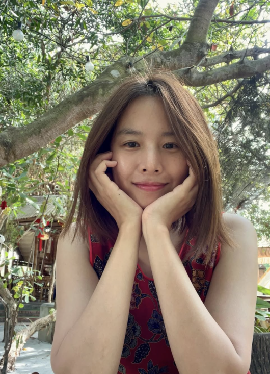 붉은 플라워 패턴의 민소매 원피스를 입은 그는 나무 테이블에 앉아 어딘가를 바라보거나, 두 손으로 턱을 괴고 카메라를 응시하며 잔잔한 미소를 짓고 있다. 자연광 아래 수수한 민낯과 단정한 단발 헤어가 어우러지며 특유의 청초한 분위기를 더했다. 초록빛이 가득한 배경과 대비되는 레드 컬러 의상이 한층 또렷한 존재감을 드러낸다.