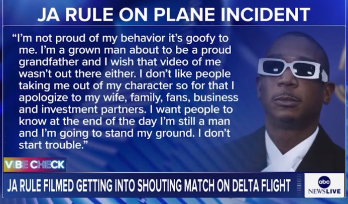(MHN 임세빈 기자) 래퍼 자 룰(Ja Rule)이 기내에서 동료 래퍼들과 언쟁을 벌인 영상이 확산된 가운데, 공식 사과 입장을 밝혔다.