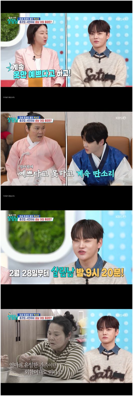 박서진 가족의 설날 맞이 새해 모임은 다소 삭막했다. 박서진은 “엄마는 무수리 같다”라며 어머니의 한복 차림에 대해 전혀 곱지 않은 말을 했다. 박효정은 “예쁜 말 하기로 안 했냐?”라며 화를 냈고, 김지혜는 “옷만 예쁘다고 하는 거잖아”라며 지적했다.