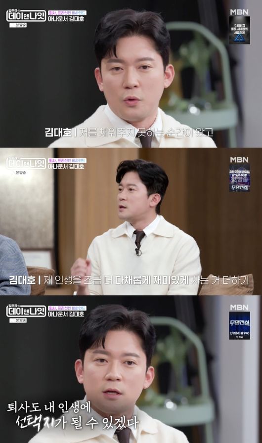 김대호는 퇴사를 결심한 이유에 대해 “돈이 1번은 아니었다. 10여년 간은 수동적인 회사원이었다. 좋은 기회에 바빠지기 시작했다. 3년여를 누구보다 열심히 했다. 보상이 많았다. 모든 보상들이 저를 채워주지 못하는 순간이 왔다. 모험이긴 하지만 퇴사도 내 인생에 선택지가 될 수 있겠다,는 생각을 했다”라고 덧붙였다.