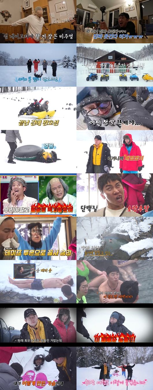 김지민과 신혼 생활 중인 김준호는 “일본인들은 벌거벗고 들어간대. 남녀 혼탕이야”라고 현지 온천 문화를 알려줬고, 홍인규는 “진짜 사람들이 벗고 들어가 있어!”라며 충격에 빠졌다. 놀라움도 잠시, ‘독박즈’는 수영복으로 환복해 약 47도에 달하는 노천탕에 몸을 담갔다. 특히 ‘몸짱’ 유세윤은 노천탕 가장자리의 눈밭에 누워 근육질 자태를 과시했지만, 질투에 사로잡힌 김준호는 “숏! 베리 숏!”이라며 관광객들 앞에서 유세윤의 다리 길이를 디스해 현장을 초토화시켰다.