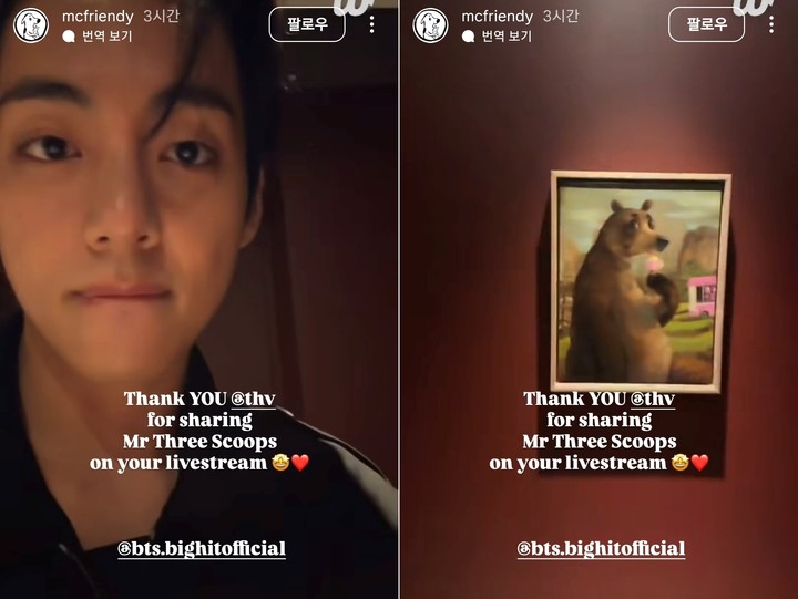 뷔는 “제가 좋아하는 그림 하나 더 있어요. 자세히 보면 곰돌이가 아이스크림 먹고 있습니다”라며 귀여운 그림도 보여주며 사랑스러운 표정을 지었다. 그러면서 “새로운 친구들이 좀 많은데 정리를 다 하지 못해서 하나하나 천천히 나중에 공개할게요”라고 약속했다.