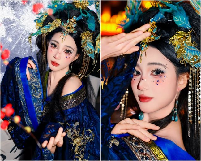 공개된 사진 속 율희는 푸른빛이 감도는 전통풍 의상을 입고 화려한 금빛·청록빛 장식이 더해진 헤어스타일로 시선을 압도했다. 이국적인 메이크업과 반짝이는 페이스 포인트, 강렬한 눈빛이 어우러지며 몽환적인 분위기를 자아냈다. 손에 든 랜턴과 붉은 매화 소품까지 더해져 한 편의 판타지 화보를 연상케 한다. 중국 왕홍 스타일의 변신이다.