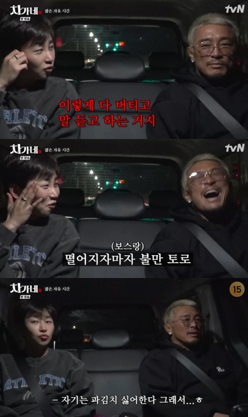 이날 추성훈과 딘딘이 피로를 풀기 위해 사우나로 향했다. 이동하는 차 안에서 딘딘이 "사실 우리니까 잘 듣고 버티지, 다른 사람이었으면 이미 한번 뒤집었다"라며 속내를 털어놨다. 추성훈이 격하게 공감했다. "진짜 무서운 사람이야, 다 가져가니까"라고 거들었다.