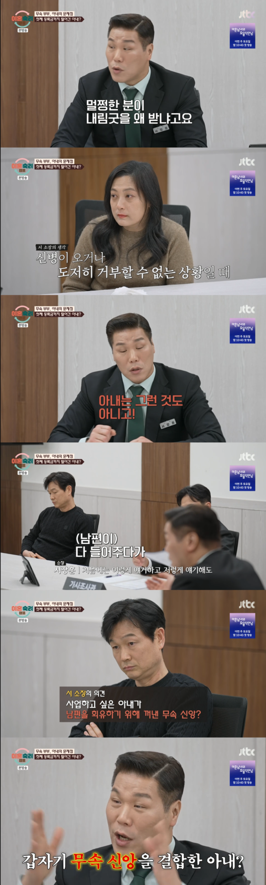 특히 서장훈은 아내가 무속에 빠진 배경에 대해 “(남편이) 다 들어주다가 어느 타이밍부터 안 들어주니까 갑자기 무속이 결합이 돼가지고, 그냥 말하면 안 들어주니까 ‘내가 보인다, 뭐가 보이니까 그렇게 해야 된다’로 접목시켜가지고 얘기하는 게 아닌가라는 생각마저 든다”라고 의심의 눈초리를 보냈다.