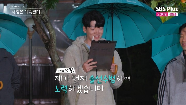 이날 '나솔사계' 멤버들은 슈퍼 데이트권을 걸고 '출산 장려'을 주제로 웅변 대회를 하는 시간을 가졌다. 이때 22기 상철은 우리나라의 저출산 문제를 언급하며 "제가 먼저 솔선수범해서 노력하겠습니다"라며 "백합 님을 붙잡겠다"라는 공개 프러포즈를 날렸다.