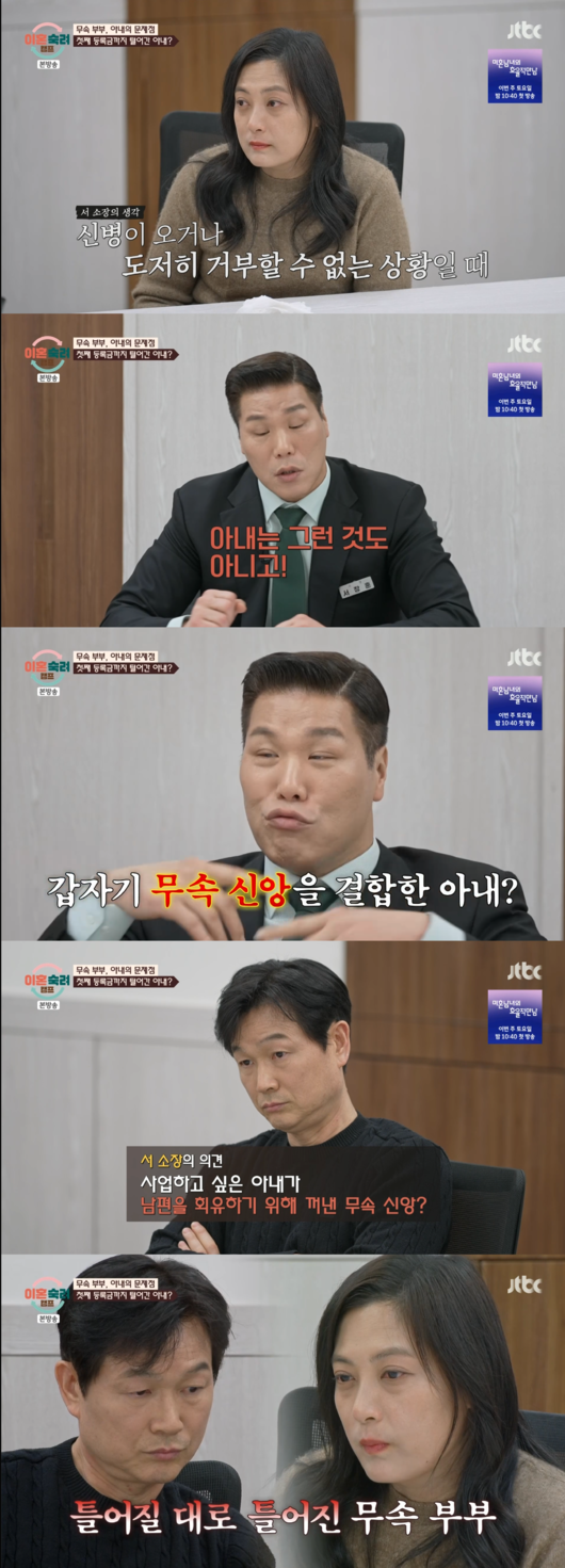 26일 전파를 탄 JTBC ‘이혼숙려캠프’에서는 ‘무속 부부’의 남은 이야기와 19기 마지막 부부의 가사조사가 공개됐다.