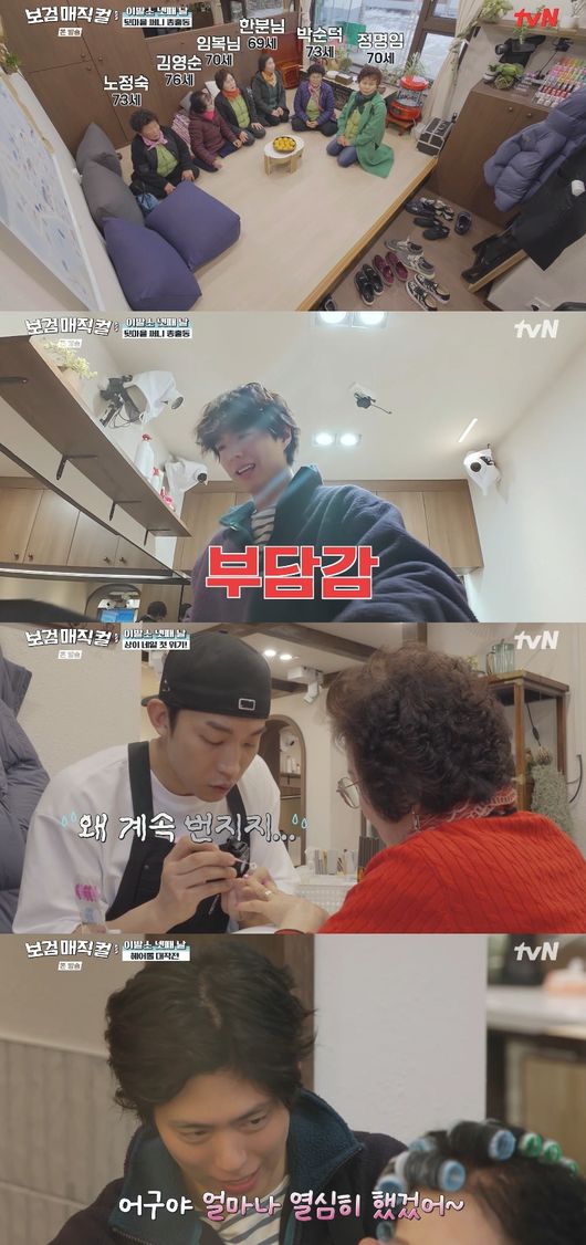 박보검은 드라이를 요청한 어머님들 한 분, 한 분 정성스레 헤어롤을 말아줬다. 같은 시각, 이상이는 박보검 속도에 맞춰 네일을 했으나 하트가 번지면서 고군분투 했다.