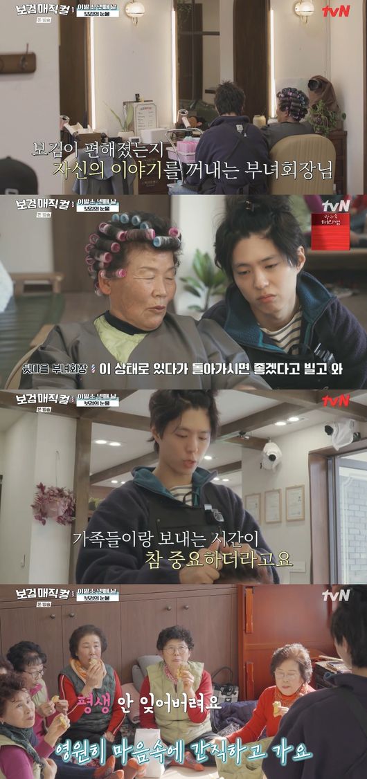 어느새 세 번째 손님을 마치고, 마지막 부녀회장님 머리 손질을 하게 된 박보검은 치매에 걸린 93세 시어머니를 챙기는 사연을 듣고 감동을 받았다.