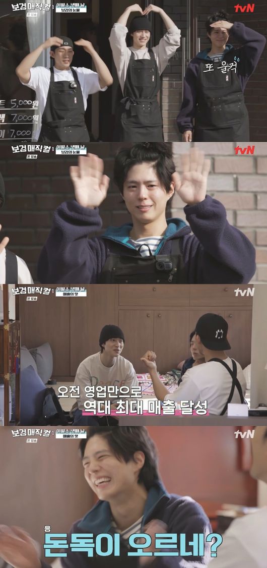 오전 매출만 6만 원을 번 상황. 박보검은 잠시 생각하더니 “마음 가는대로 주셔유 해도 되겠다”라고 말했다. 놀란 곽동연은 “갑자기 뭐냐. 더 받고 싶냐. 한번 받아보니까”라고 물었고, 박보검은 “돈독이 오르네”라고 너스레를 떨었다. 이를 들은 이상이는 “우리가 진지하게 사업을 해서 그런 것 같다”라고 박보검 마음을 이해했다.