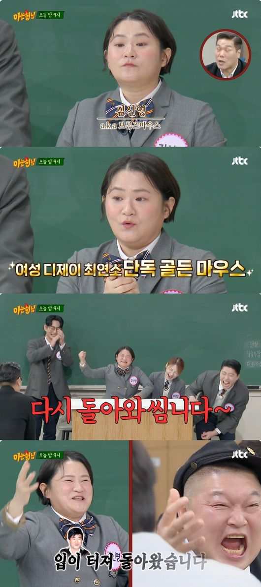 ‘아는 형님’ 멤버들은 김신영에게 개인기를 부탁했다. 그러자 김신영은 이계인 성대모사로 “다시 돌아왔습니다. 입으로 먹고 사는 신영이, 입이 터져 다시 돌아왔습니다”라고 자신을 소개해 웃음을 줬다.