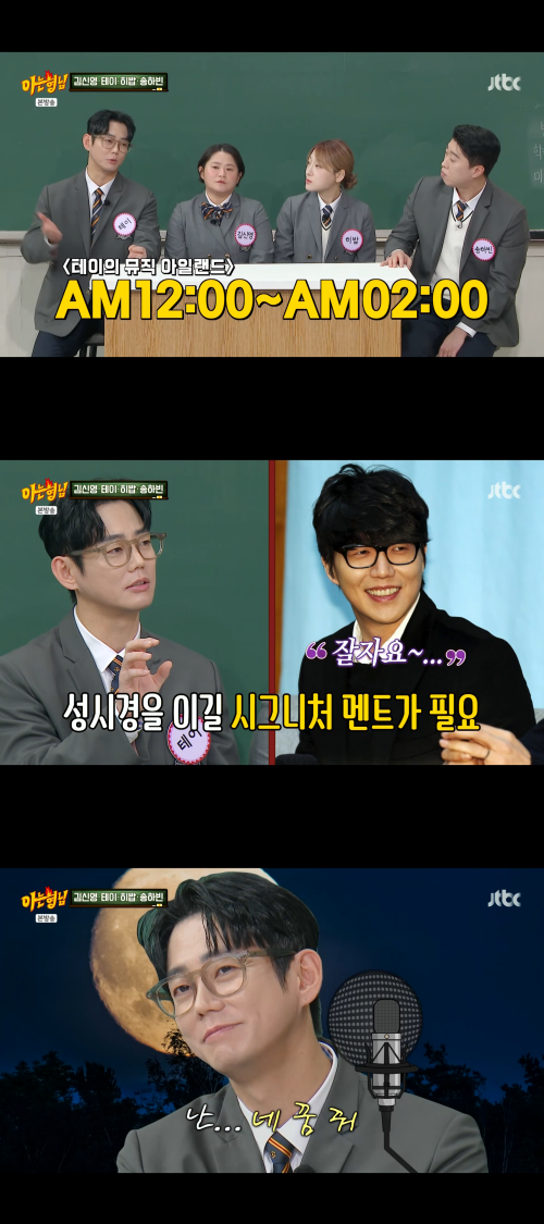 테이는 “그때는 진짜 편안하게 이야기를 했다”며 당시를 떠올렸다. 이어 “마지막에 자기 전에 성시경 선배의 ‘잘 자요’ 시그니처 멘트가 있어서 그걸 이길 멘트를 만들어야겠다고 생각했다”며 “무리수를 둬서 많이 혼났다”고 털어놨다.