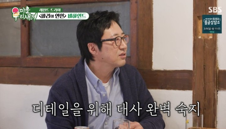 이동건은 '파리의 연인'으로 최고의 인기를 누리던 시절을 떠올리며 "발이 약간 공중에 떠 있는 기분이었다"라고 소회를 밝혔다. 그러면서 "선배님에 대해 기억 남는 게, 대본을 손에 들고 다니지 않고 항상 완벽하게 외우고 다니셨다"라며 박신양의 프로페셔널한 면모를 추억했다. 이에 박신양은 "대본은 계속 본다. 촬영에 들어가면 대본을 읽을 게 아니니까. 상황이 중요하겠죠. 그 디테일이 다 살아있게 하려면"이라며 연기 철학을 전했다.