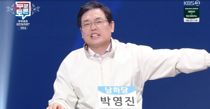 박영진은 남편들의 불만을 대변하며 "남편들 퇴근하고 신발 벗으려고 하는데 아내들은 분리수거부터 시킨다"라며 "그래 뭐, 해줄 수 있다. 근데 분류하다 우유 같은 거 처리 안 해놔서 다 묻는다. 그래도 분리수거 다 하고 집에 돌아가면 한다는 소리가 뭐, '음쓰?'(음식물 쓰레기 버려줘)"라고 말해 웃음을 자아냈다.