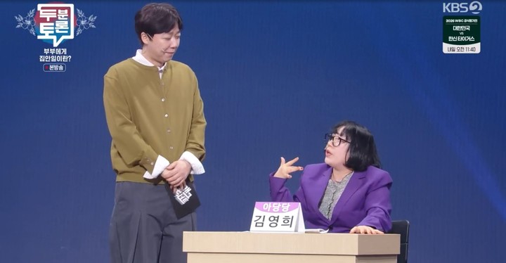 이날 '남하당' 대표 개그맨 박영진과 '아당당' 대표 개그우먼 김영희는 '부부에게 집안일이란?' 주제로 토론을 펼쳤다.