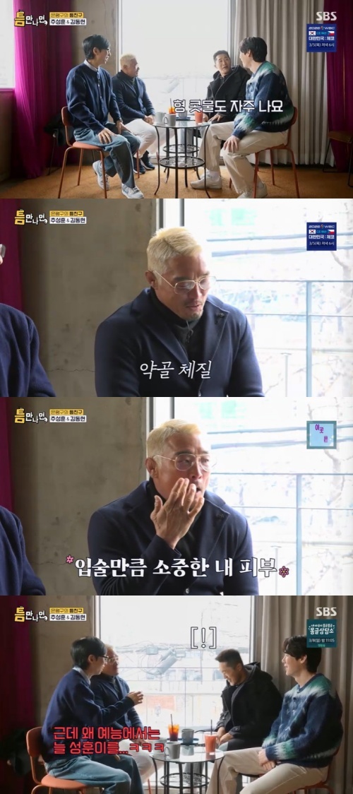 이때 김동현이 "아니다. 형 감기 잘 걸린다. 콧물도 자주 난다"라고 폭로해 주위를 웃음바다로 만들었다. 추성훈이 인정하면서 피부도 건조하다고 고백했다.