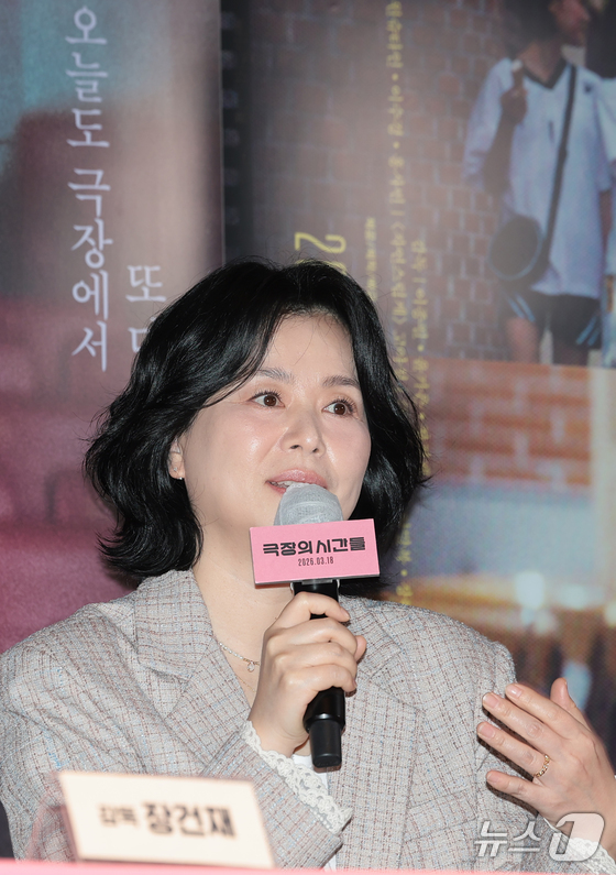배우 장혜진이 3일 서울 종로구 씨네큐브에서 열린 영화 ‘극장의 시간들’ 언론시사회 및 기자간담회에 참석해 취재진 질문에 답하고고 있다. '극장의 시간들'은 관객, 감독, 배우 등 다양한 인물들을 주인공으로 영화적 재미는 물론 극장이라는 장소가 지닌 예술적·사회적 의미를 조명한다. 특히 대한민국 대표 예술영화관 씨네큐브가 개관 25주년을 맞아 제작한 작품으로 극장과 영화의 미래에 대해 새로운 도전과 희망을 제시해 더욱 높은 관심을 끌고 있다. 2026.3.3 © 뉴스1 권현진 기자