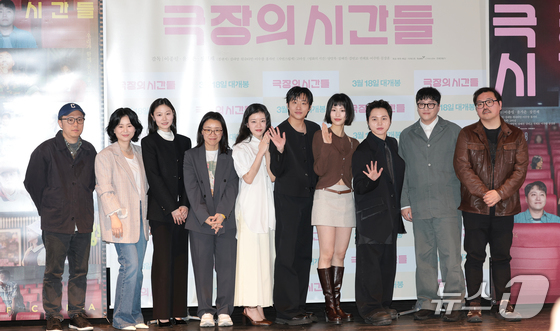장건재 감독(왼쪽부터)과 배우 장혜진, 김연교, 윤가은 감독, 고아성, 홍사빈, 이수경, 원슈타인, 김대명이 3일 서울 종로구 씨네큐브에서 열린 영화 ‘극장의 시간들’ 언론시사회 및 기자간담회에 참석해 포즈를 취하고 있다. '극장의 시간들'은 관객, 감독, 배우 등 다양한 인물들을 주인공으로 영화적 재미는 물론 극장이라는 장소가 지닌 예술적·사회적 의미를 조명한다. 특히 대한민국 대표 예술영화관 씨네큐브가 개관 25주년을 맞아 제작한 작품으로 극장과 영화의 미래에 대해 새로운 도전과 희망을 제시해 더욱 높은 관심을 끌고 있다. 2026.3.3 © 뉴스1 권현진 기자