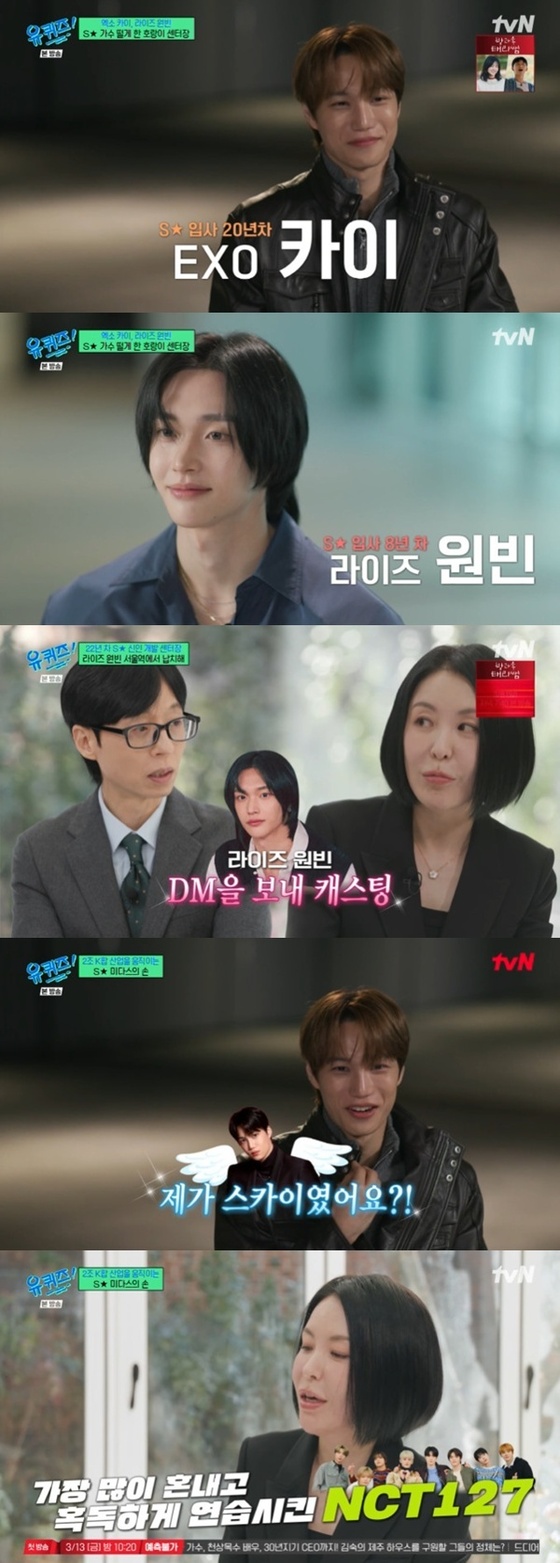 이날 윤희준 센터장은 카이도 몰랐던 엑소 예명의 비밀을 공개했다. 윤희준 센터장은 '하늘에서 내려준 아이다'라는 생각에 '스카이'에서 '스'를 뺀 '카이'라는 예명을 지었다고. 더불어 가장 독하고 성실한 아티스트로 카이, 도영, 원빈을 꼽은 윤희준 센터장은 가장 많이 혼내고 혹독하게 연습시킨 아티스트로 NCT127을 꼽아 눈길을 끌었다.