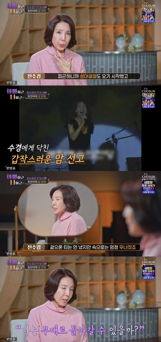 전수경은 아버지에게 “나 수술하고 목소리가 갈라지고 떨리는 소리가 나는 건데 알고 있었냐”고 물었다. 아버지는 딸의 갑상선 수술 당시부터 알고 있었다며 “한동안 노래도 못 부르지 않았나”라며 “내가 표현력이 약해서 그렇지. 다 안다”라고 답했다.