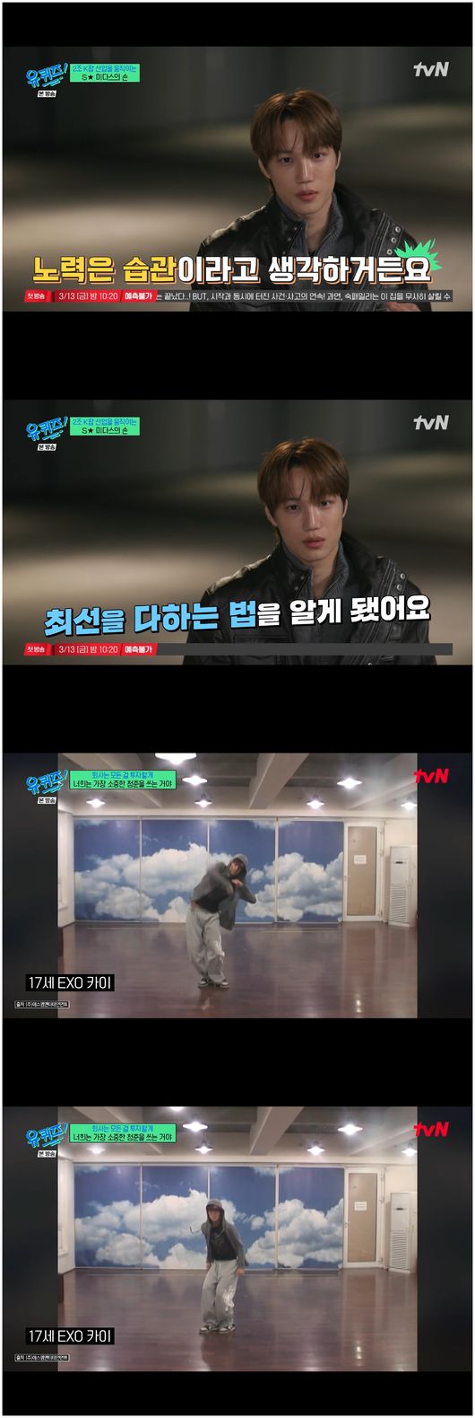 정작 카이는 “노력은 습관이라고 생각한다”라며 “처음에는 노력하는 법을 모른다. 그걸 누나들이 알려준다. 그래서 그게 습관이 되고, 인생에 있어서 가수 외에 모든 게 노력을 하게 된다. 최선을 다하게 됐다. 그래서 인생을 알려준, 정말 감사하다”라며 겸손하게 말했다.