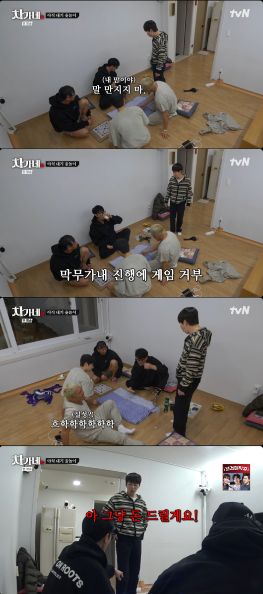 결국 시작된 야식 내기 윷놀이. 하지만 차승원의 제멋대로인 진행에 딘딘은 참지 못하고 분노를 표출했다. 딘딘은 “이거 아니야 진짜”라며 억울함을 호소하다 급기야 “나 안 해”라며 게임 거부 선언까지 했다.