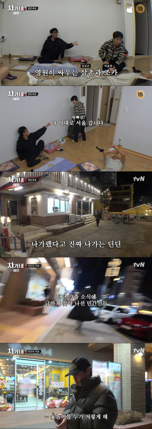 서운함이 극에 달한 딘딘은 옷을 챙겨 입고 “나 이대로 서울 갑니다”라는 선언과 함께 숙소를 이탈하는 가출행을 감행했다. 딘딘은 편의점 인근을 배회하며 한참 동안 불만을 쏟아내 웃음을 안겼다.