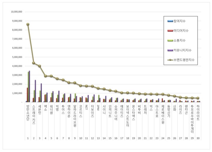 한편, 이번 3월 분석에는 방탄소년단, 스트레이 키즈, 세븐틴, 엑소, 워너원 등 최정상급 그룹을 포함해 총 50개의 보이그룹 브랜드가 포함됐다.