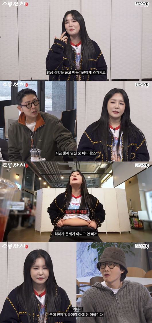 그런 가운데 이용진은 “살이 많이 빠졌네?”라고 물었다. 랄랄은 “안 빠졌다”라고 속상해했고, 해리포터가 “지금 둘째 임신 중 아니냐. 느낌이 앉아있는 느낌이 약간 몸 아끼는 느낌이다”라고 의심하자 “아니다”라고 답했다.