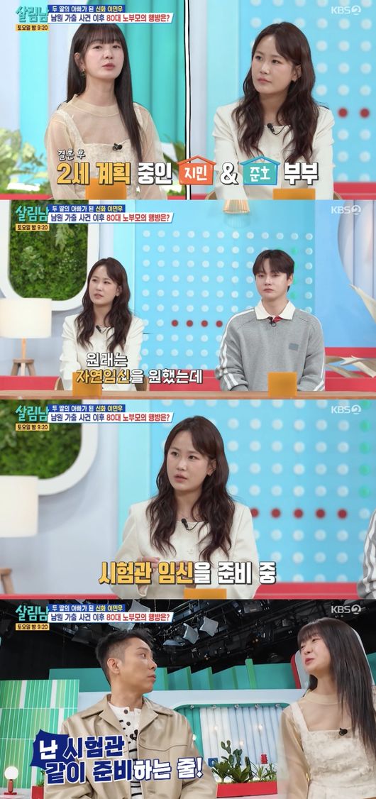 이날 이요원은 “2세계획 중이라고 하던데 준비 잘 되시냐”라고 물었다. 김지민은 “원래는 자연 임신 시도하려고 했으나 저희가 둘다 노산이라서 얼마 전에 시험관 시술하기 전에 나팔관 조영술을 했다. 말도 안되는 아픔을 겪었다”라고 밝혔다.