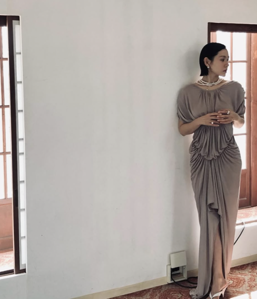 고풍스러운 한옥 배경과 어우러진 드레스 차림의 손예진은 화려한 드레스에 진주 목걸이를 매치해 고급스러움을 더했으며, 특유의 단아하면서도 고혹적인 분위기를 자아냈다.