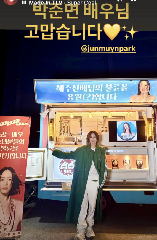 10일 인 오늘 김혜수가 자신의 SNS에 후배가 보낸 커피차 앞에서 찍은 사진을 공개하며 “박준면 배우님 고맙습니다”라는 문구와 함께 인증샷을 올렸다.
