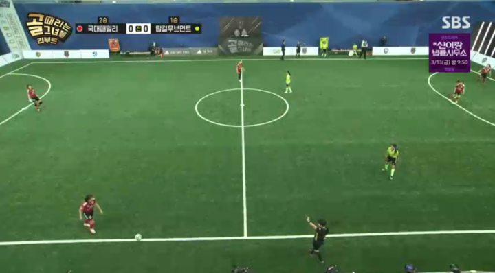 전반전은 양 팀의 팽팽한 기싸움 속에 치열하게 전개됐다. 탑걸무브먼트의 이유정은 빠른 스피드와 압박으로 국대패밀리의 골문을 위협했다. 특히 이유정은 공간이 열릴 때마다 과감하게 치고 들어가 골키퍼와 1대1 찬스를 맞이했으나, 결정적인 순간마다 막히며 득점으로 이어지지는 않았다.