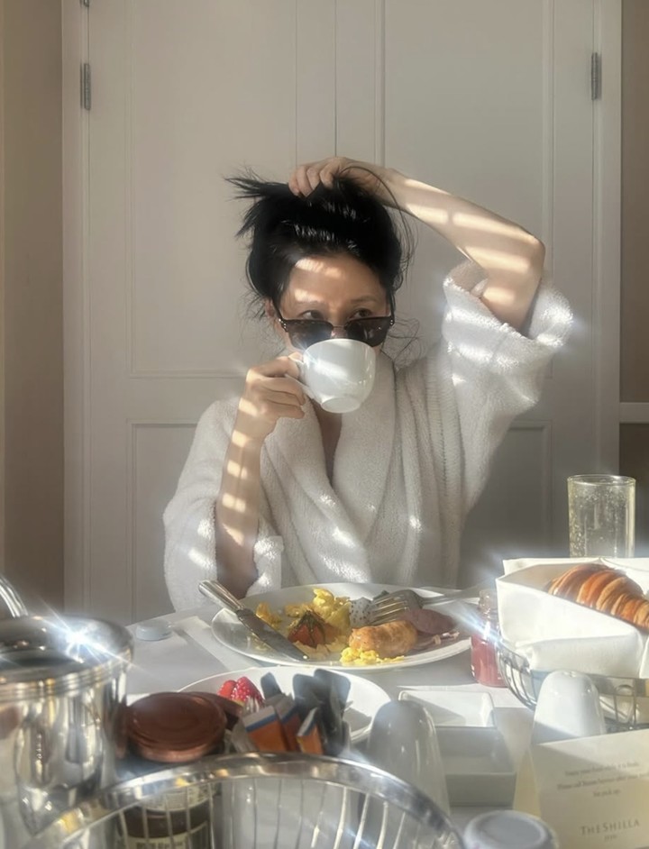 공개된 사진 속 이영애는 호텔로 보이는 공간에서 아침 시간을 보내고 있다. 그는 흰색 목욕 가운을 입은 채 선글라스를 착용하고 테이블에 앉아 여유롭게 커피를 마시는 모습을 보여줬다. 식탁 위에는 크루아상과 과일 등 다양한 조식 메뉴가 놓여 있어 고급스러운 분위기를 자아냈다. 이영애는 자연스럽게 머리를 정리하며 편안한 시간을 보내는 모습에서 꾸밈없는 매력을 뽐냈다.