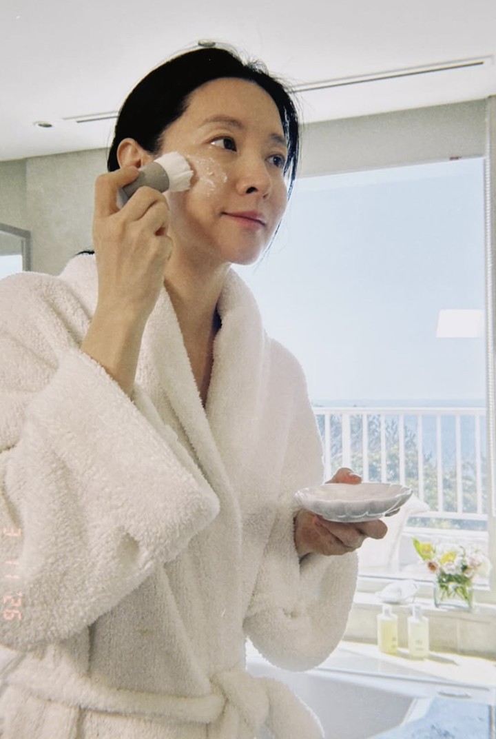 이영애는 또 다른 사진에서 피부 관리에 집중하는 모습을 보여줬다. 가운 차림으로 거울 앞에 선 이영애는 얼굴에 크림을 바르며 홈케어에 집중했다. 특히 이영애는 거의 화장을 하지 않은 상태임에도 또렷한 이목구비와 맑은 피부를 자랑해 눈길을 끌었다.