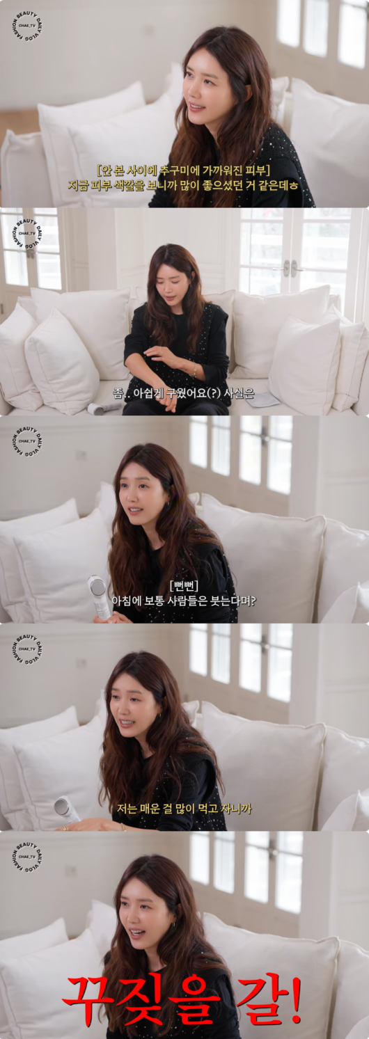 이어 평소 애용하는 뷰티 디바이스를 소개하던 채정안은 “아침에 보통 사람들은 붓는다며?”라는 뻔뻔한 질문을 던져 현장에 웃음을 자아넀다. 부기를 모르는 '관리광'다운 면모에 제작진이 "저는 매운 걸 많이 먹고 자니까 (붓는다)"라며 실토하자, 채정안은 즉각 “자랑이다. 자랑이야”라고 큰 소리로 꾸짖어 폭소를 유발했다.