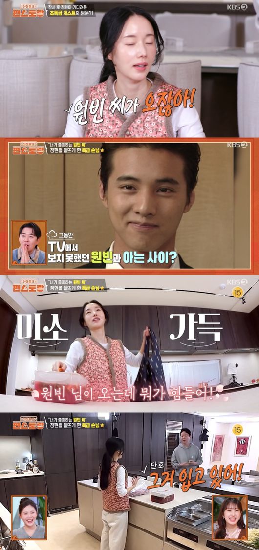 이정현은 “원빈 님 오는데 이거 입어도 되냐. 나 더 예쁘게 입으면 안 되냐”라고 했고, 남편은 “그거 입고 있어라. 뭘 그렇게까지”라고 질투해 웃음을 자아냈다.