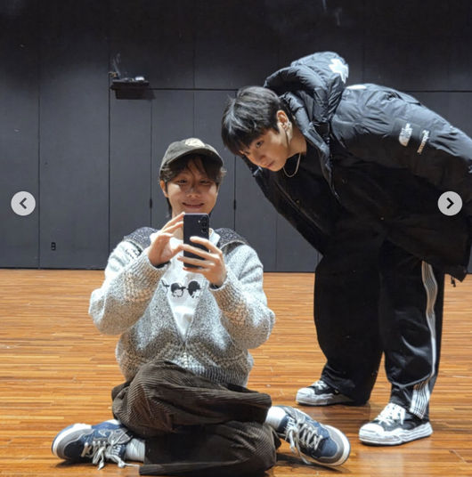 특히 제이홉과 정국이 함께 찍은 거울 셀카가 눈길을 끌었다. 연습실 바닥에 앉아 휴대폰으로 사진을 찍는 제이홉과 그 옆에서 몸을 숙여 카메라를 바라보는 정국의 모습이 자연스러운 케미를 자아냈다.