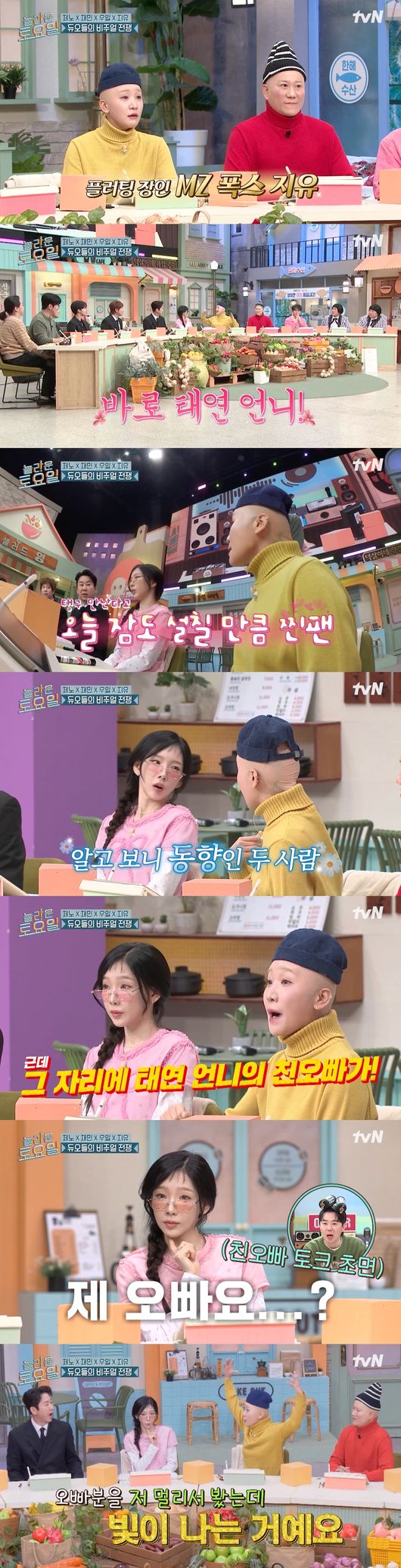 김지유는 "태연 언니가 전주 분이다. 저도 전주 사람이다. 그래서 너무 좋아하기도 하고 중학교 때인가 전주에 엔떼피아 광장이라고 있는데 거기 소녀시대 분들이 팬사인회를 왔다. 근데 거기에 태연 언니 친오빠가 그 장소에 왔다"고 설명했다.